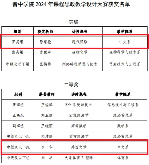 原慧艳老师凭借讲授课程《现代汉语》荣获正高组一等奖,她的课程丰富详实,实现了知识传授与价值引领的完美统一。李华老师以讲授课程《外国文学》荣获中级及以下组二等奖,从专业导入到总结升华,每个环节都精心设计。在此向原慧艳老师和李华老师表示诚挚的祝贺!