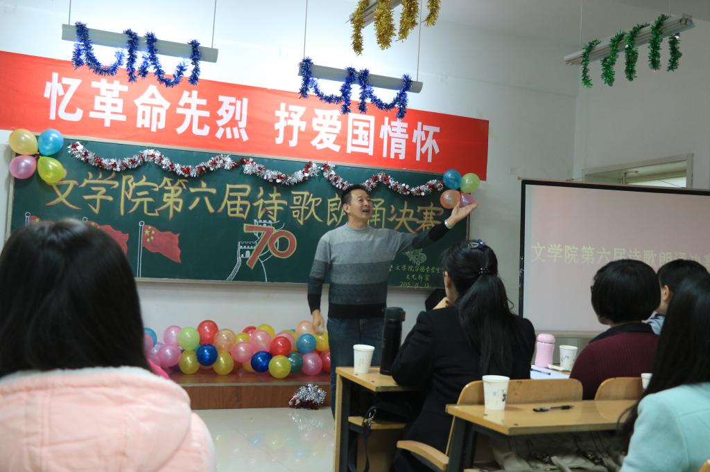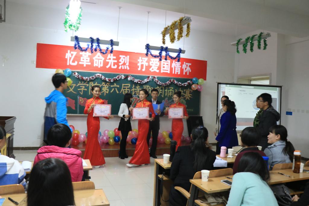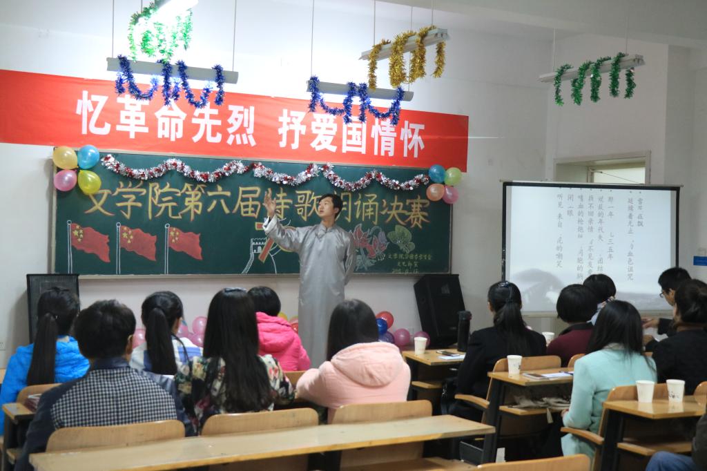 2015年11月12日晚,文学院于文澜苑② 127教室举办第六届诗歌朗诵决赛,此次比赛由分团委学生会文艺部主办,以“忆革命先烈,抒爱国情怀”为主题。由文学院党总支副书记翟立宏,文学院分团委书记、学生科科长宁宁,晋中电视台主持人杨军以及由文学院各班辅导员担任评委。